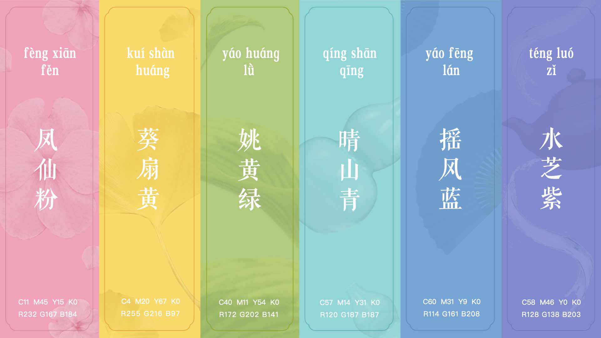 在輔助色上提取上,通過參考古代藝術(shù)品,并結(jié)合現(xiàn)代審美,提煉出鳳仙粉,葵扇黃、姚黃綠、晴山青等古典色彩,確保輔助色與主色相融合,形成一套和諧的色彩組合。