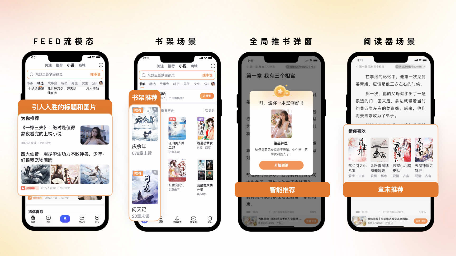 在推薦形式上,我們也采用了多樣化的推薦方式。例如在首頁增加了feed流形態(tài)的信息模塊,以更直觀的圖文展現(xiàn)方式,幫助用戶發(fā)現(xiàn)他感興趣的內(nèi)容。在書架場(chǎng)景,針對(duì)于書架內(nèi)容少的用戶,自動(dòng)的放置兩本高流量書籍,幫助用戶高效的觸達(dá)內(nèi)容。與此同時(shí),我們還會(huì)根據(jù)用戶行為數(shù)據(jù),采用彈窗形式和章尾推薦等形式主動(dòng)向用戶推薦與其喜好度高的內(nèi)容,方便用戶高效的觸達(dá)他感興趣的內(nèi)容。