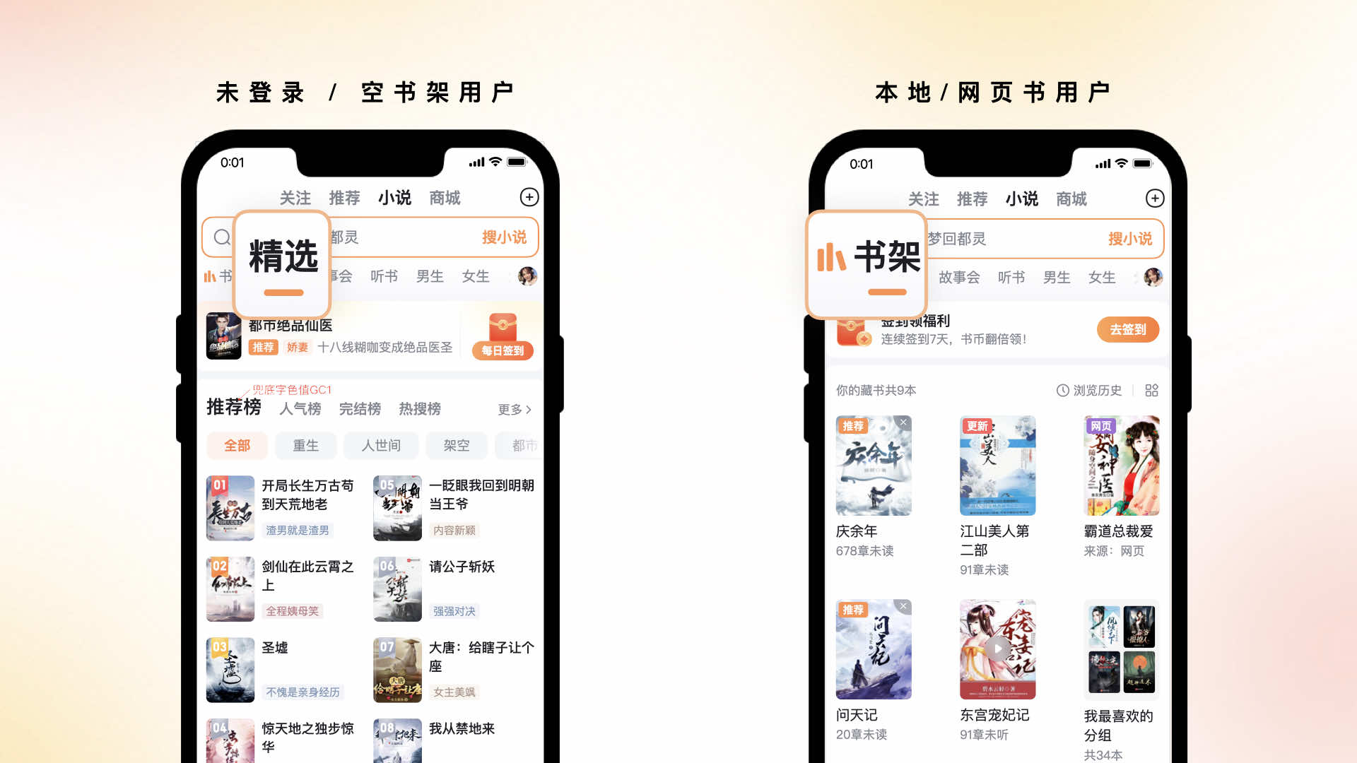 以人為本的設(shè)計(jì)能夠更貼心地滿足用戶的需求和期望,通過關(guān)注用戶的喜好、行為和習(xí)慣,讓用戶體會(huì)到關(guān)懷和舒適的享受。因此,針對(duì)于不同的用戶行為進(jìn)行了精細(xì)化的設(shè)計(jì)。對(duì)于未登錄、書架為空的用戶,我們默認(rèn)為用戶錨定到精選的tab,而針對(duì)本地書、網(wǎng)頁書的用戶,我們?yōu)槠涠ㄎ坏綍艿膖ab,方便用戶更精準(zhǔn)的切入場(chǎng)景。