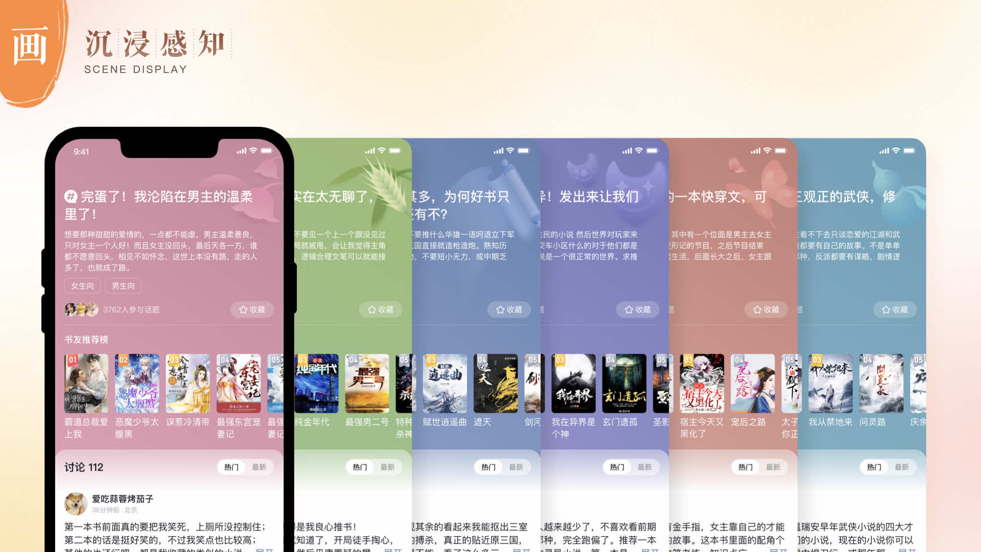 人文感設(shè)計(jì)語言融合了簡(jiǎn)約、舒適、自在的設(shè)計(jì)體驗(yàn),讓人能夠輕松沉浸其中,并感受到獨(dú)特的國風(fēng)韻味和情感內(nèi)涵。小說設(shè)計(jì)團(tuán)隊(duì)從“色、字、構(gòu)、畫”四個(gè)維度進(jìn)行拆解。