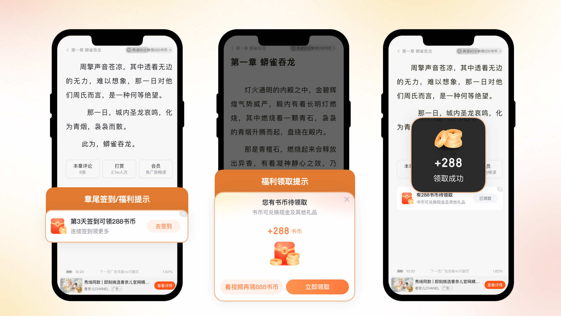 在閱讀器場(chǎng)景,我們?cè)黾恿苏挛埠桶雽咏饚蓬I(lǐng)取提示,即時(shí)提醒用戶領(lǐng)取福利,同時(shí),強(qiáng)化領(lǐng)取成功樣式,增強(qiáng)用戶的獲得感。