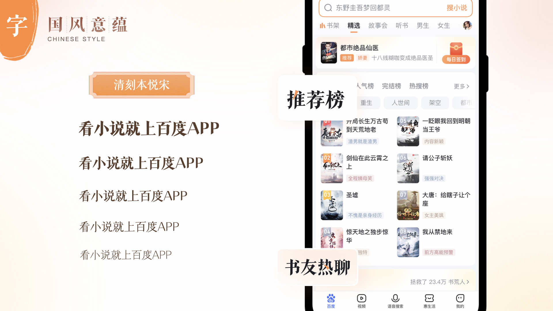 基于國風(fēng)意韻感,設(shè)計(jì)團(tuán)隊(duì)在文字的使用上,也選擇了一套襯線體字體,該字體字形瘦長(zhǎng),柔美清透且識(shí)別度高。在界面中,主要在標(biāo)題區(qū)應(yīng)用這套字體,將其中的一筆進(jìn)行跳色點(diǎn)綴,不僅讓用戶閱讀舒適,而且提升百度小說的品牌識(shí)別度。