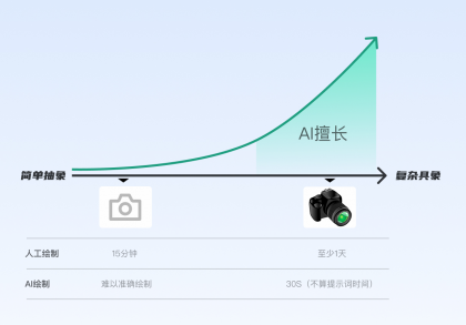不考慮思考過程時間消耗,將人工手繪和AI繪制對比,AI可能無法穩定的繪制靠左的相機圖形,但可以很快、較穩定的繪制右邊的相機,而人去繪制右邊相機可能需要至少一天時間,還不一定有AI效果好。