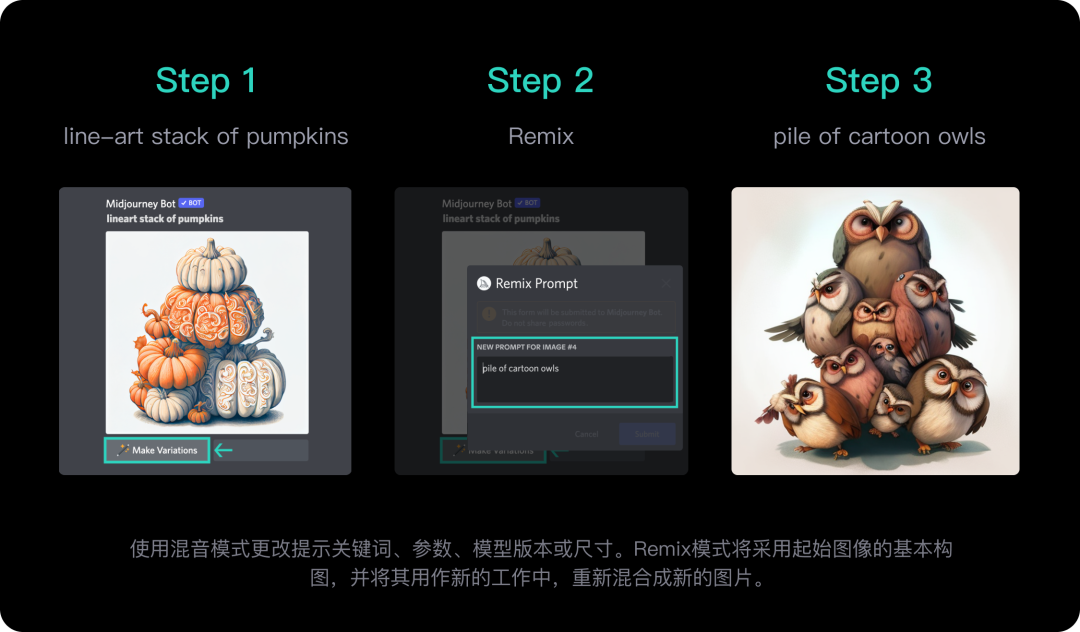 回顧之前《ASAK|全面解析Midjourney參數和指令》的案例,使用的步驟如下:點擊Make variations,在彈出窗口中修改或輸入新的提示。例如在輸入框里輸入pile of cartoon owls(一堆卡通貓頭鷹)。最終生成的圖片對應的貓頭鷹代替南瓜。
