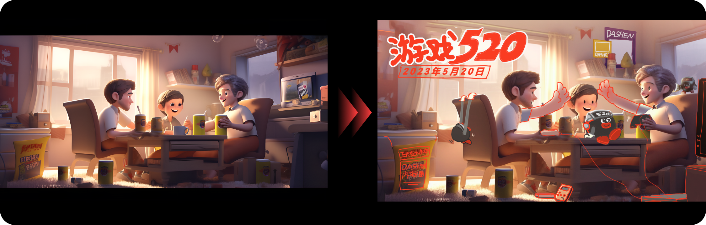 得到這張圖后,覺得畫面左上角部分有些空白,為了襯托歡快聚會的氛圍,我們決定在左上方加上掛旗。方法也是運用Midjourney的混音模式。在關鍵詞中加入“屋子里掛著彩旗”。