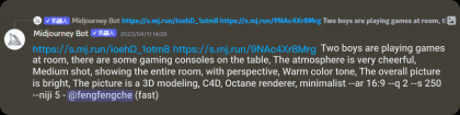緊接著我們用之前篩選出來的其中一張或多張圖片,在Midjourney中進行墊圖,根據之前所得結論對關鍵詞進行優化,再開始新的一輪煉圖。(關鍵詞增加了“中景”、“展示整個房間”、“透視感”、“畫面明亮”。)