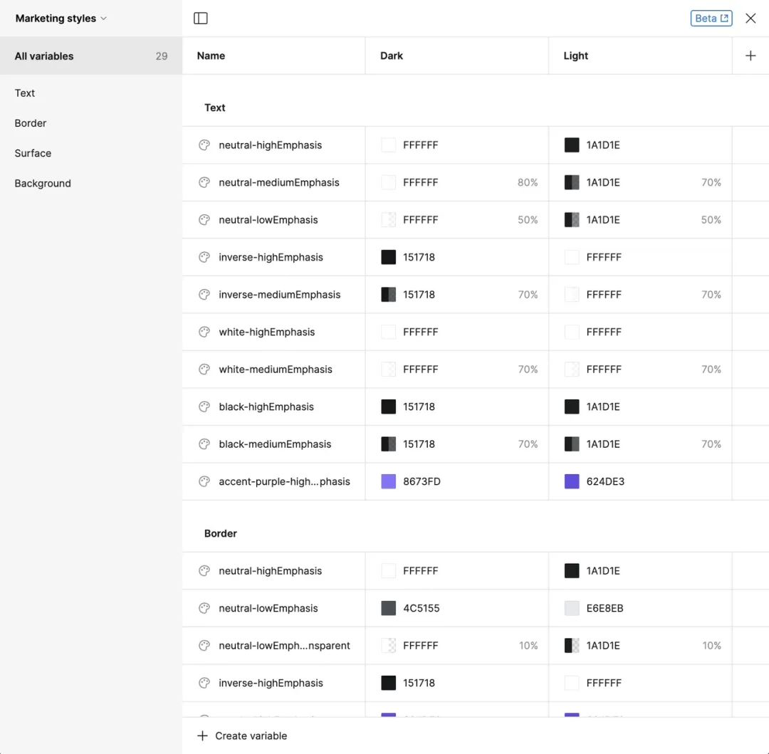 騰訊文檔顏色變量表 網(wǎng)上有很多關(guān)于如何使用軟件色彩樣式命名的方式來實現(xiàn) Token 應(yīng)用的案例,但隨著 Figma 的 Variables 功能的上線,新的應(yīng)用方式已經(jīng)改寫。同時,Variables 可以實現(xiàn)除了色彩以外的更多屬性的更改,從而讓 Token 的應(yīng)用范圍在設(shè)計軟件中進一步擴大(國產(chǎn)軟件跟上也勢在必行)。
