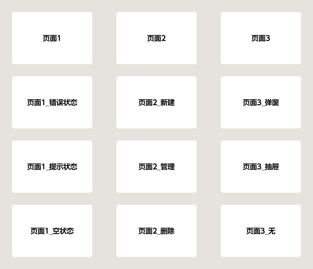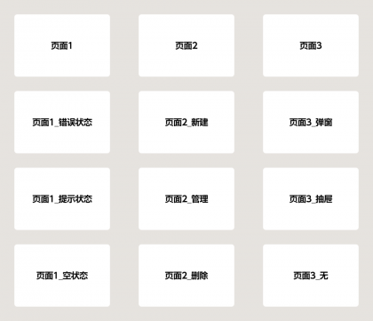 排列頁面時,也需要具有一定的邏輯,橫向一般表示不同的頁面,縱向表示同一個頁面的事件和狀態(tài)。并且橫豎間距盡量保持統(tǒng)一,建議左右不低于 800px,上下不低于200px 的間隔,這樣即不影響后續(xù)添加說明,也不影響前端查看頁面時被其它頁面干擾。