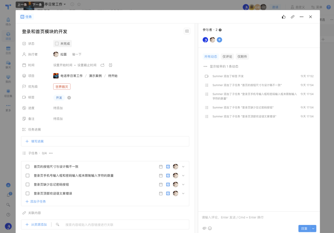 添加任務(wù)時,可以用標簽或標題前綴,來區(qū)分設(shè)計還是開發(fā)的任務(wù)。這個創(chuàng)建的過程盡量在前面說到的共識建立的溝通會議中進行,并對每個任務(wù)內(nèi)添加實現(xiàn)的目標和水平,以及對應(yīng)的負責人。