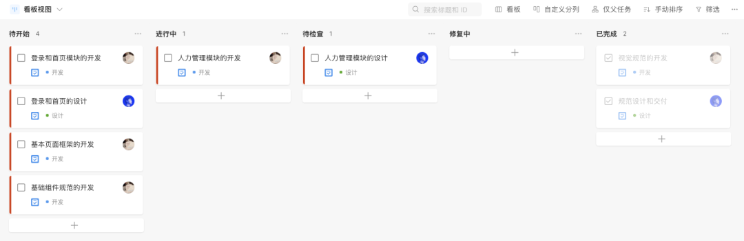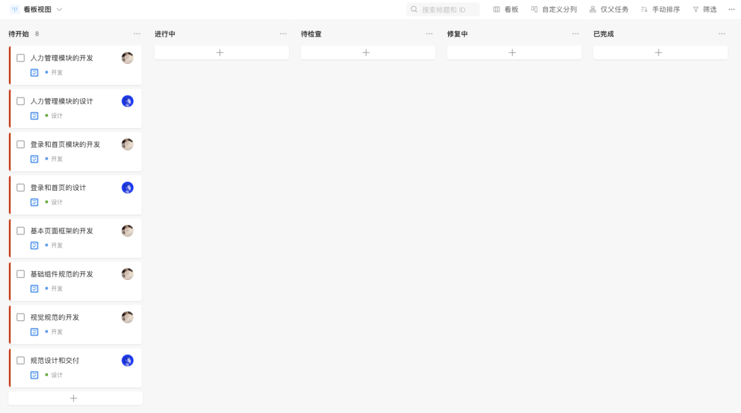 在看板工具中創(chuàng)建待開始、進行中、待檢查、修復(fù)中、已完成5個步驟,然后開始在待開始內(nèi)創(chuàng)建相關(guān)的任務(wù)卡片。
