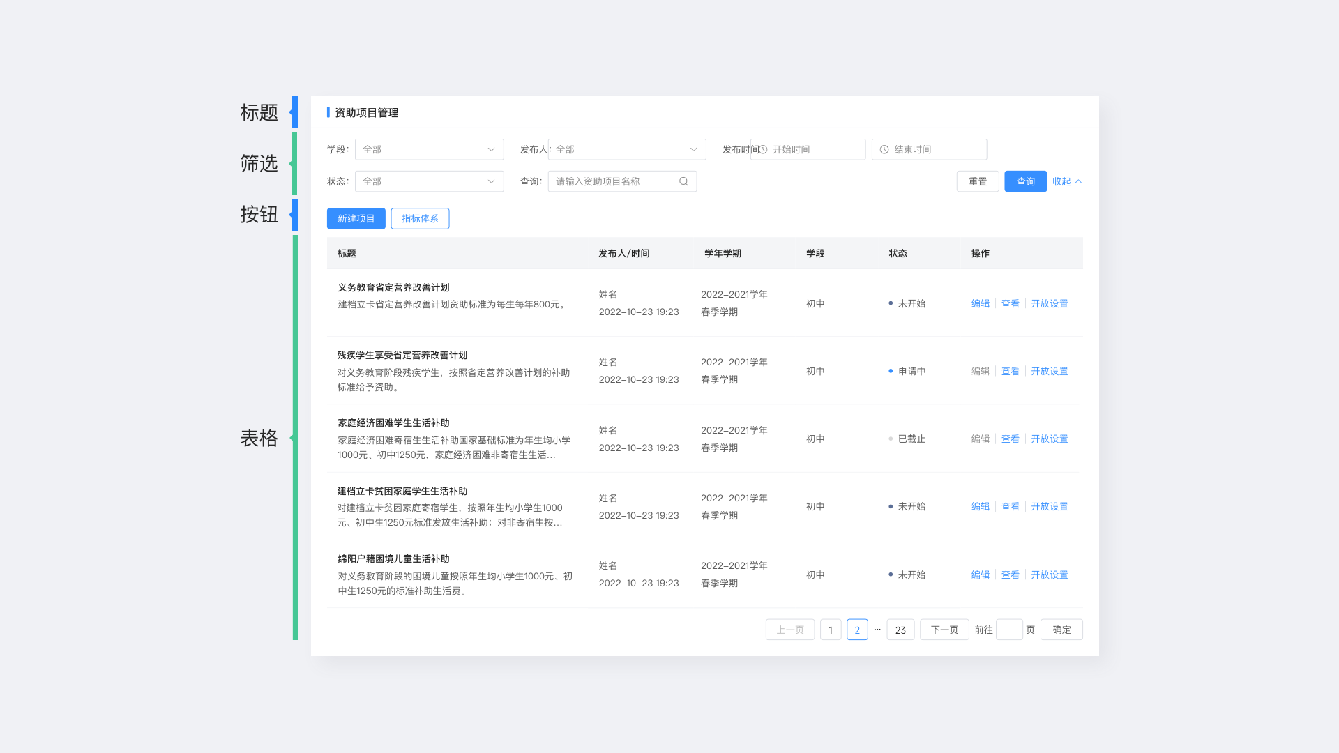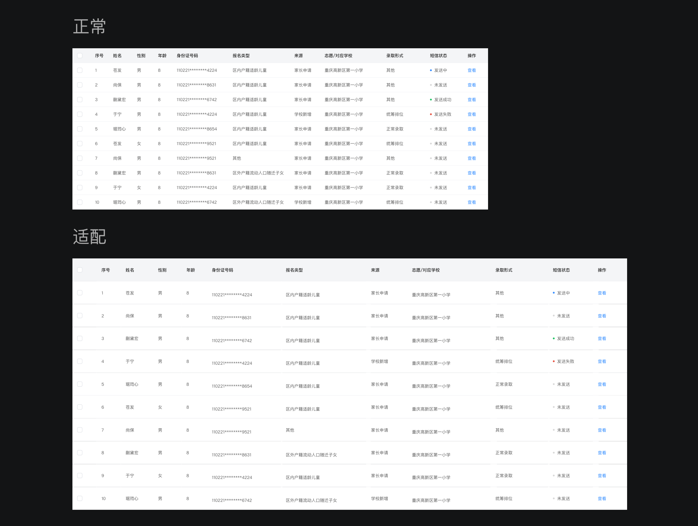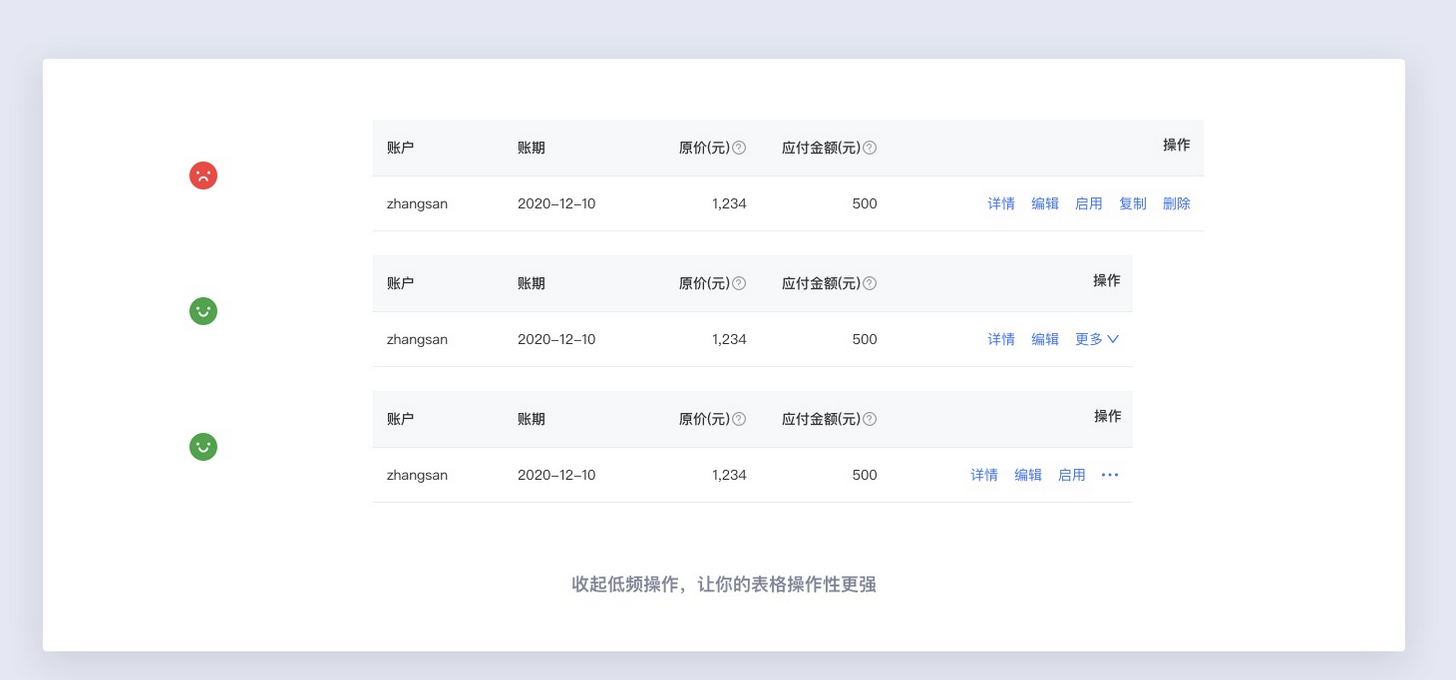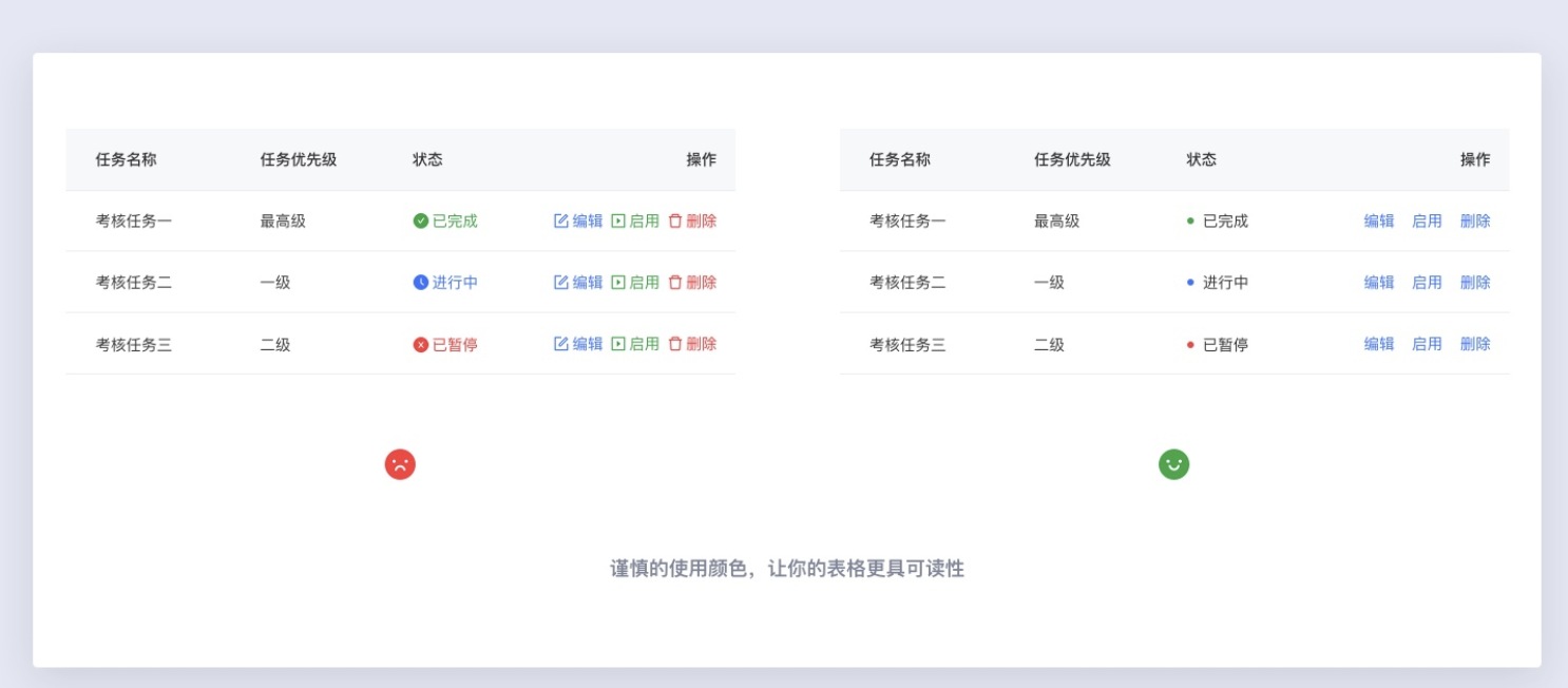 表格設(shè)計中一定不要使用過多的顏色區(qū)做狀態(tài)或操作的區(qū)分,過多的顏色細(xì)分會使表格變得更加混亂,影響用戶體驗(yàn)。對狀態(tài)的區(qū)分,僅用輕量的顏色區(qū)分即可,操作欄保持主色按鈕色。