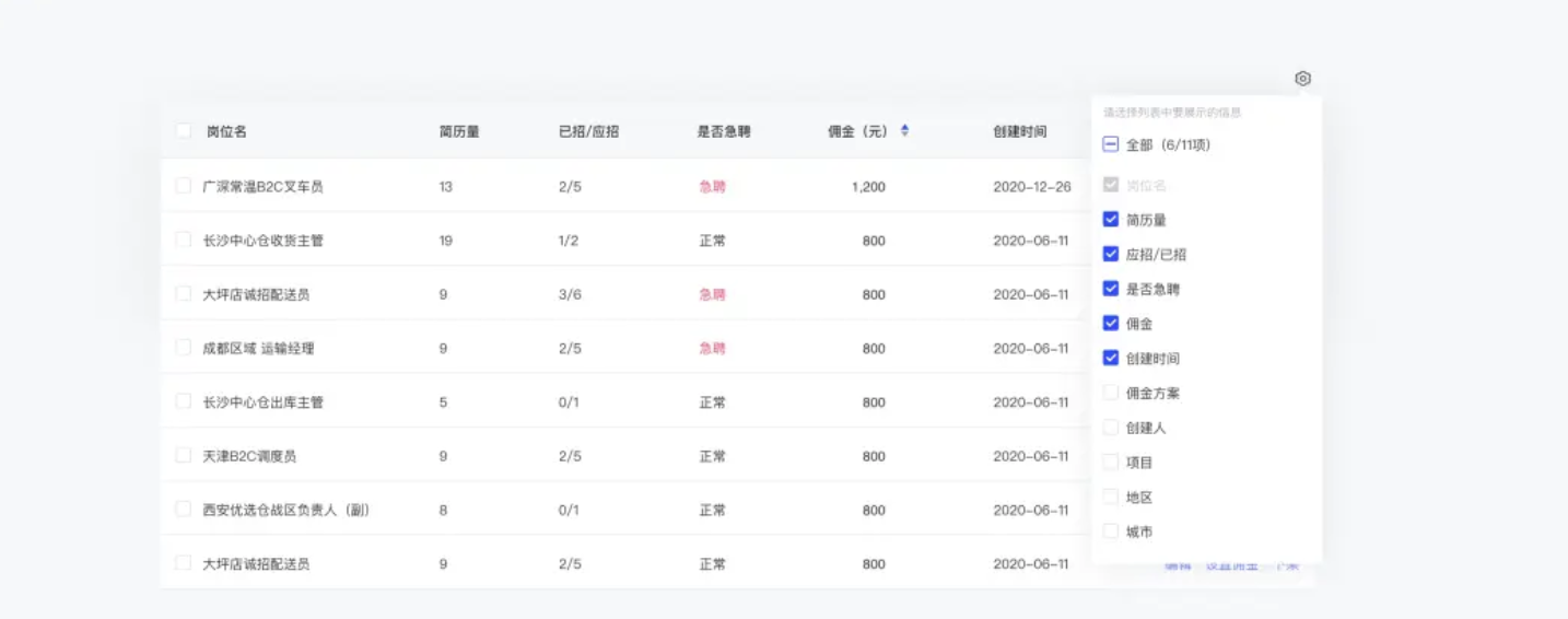 如果不同用戶想看到的信息側(cè)重不同,可以讓用戶自定義列的展示。在默認(rèn)情況下僅展示最常用、最重要的幾個指標(biāo)(如下圖)。這樣做的好處是:首先,用戶能在表格上方看到所有的指標(biāo)名稱,避免了原來需要橫向拖拽才能瀏覽到所有指標(biāo)的情況;其次,用戶可以根據(jù)自己的需要,自由的選擇顯示所需指標(biāo),隱藏不必要指標(biāo),減少干擾。但需注意系統(tǒng)應(yīng)記住用戶上一次的自定義列設(shè)置,減少用戶重復(fù)操作。