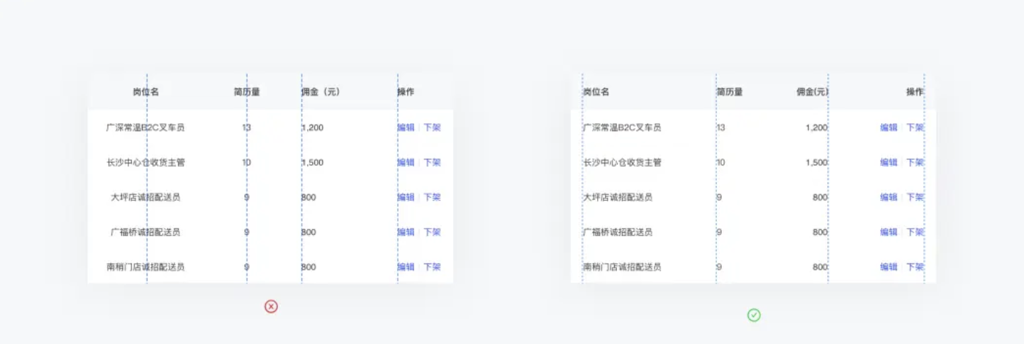 合適的對齊方式能夠提升數(shù)據(jù)的瀏覽效率。表格內(nèi)信息的縱向列對齊(符合格式塔心理學(xué)中相近原則)能夠很好的形成視覺引導(dǎo)線。通過對齊,會讓表格更加規(guī)范易理解,給用戶視覺上的統(tǒng)一感,視線流動更順暢,讓用戶快速的捕捉到所需內(nèi)容。