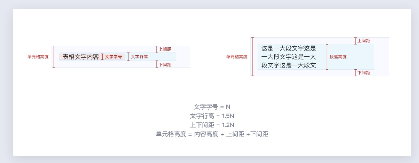 在開發(fā)同學(xué)的眼中,單元格高度=內(nèi)容高度+上間距+下間距,在實(shí)現(xiàn)設(shè)計稿時,通常也是按照這個方式來寫的,而不是像設(shè)計同學(xué)一樣按照文字的尺寸來計算間距。其中,文字行高建議設(shè)為字號的1.5倍,上下間距設(shè)為字號的1.2倍。