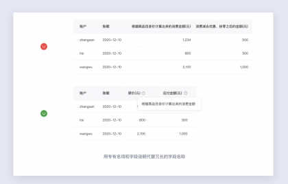 當(dāng)字段名稱過長,又必須展示,才能有效的理解字段含義時。我們可以定義一個專有名詞代替,并且在字段名稱后使用添加字段說明的形式,來對字段加以說明。這樣一來用戶既可以清晰的理解字段含義,又可以在有限的頁面空間下獲取到更多的數(shù)據(jù)信息。