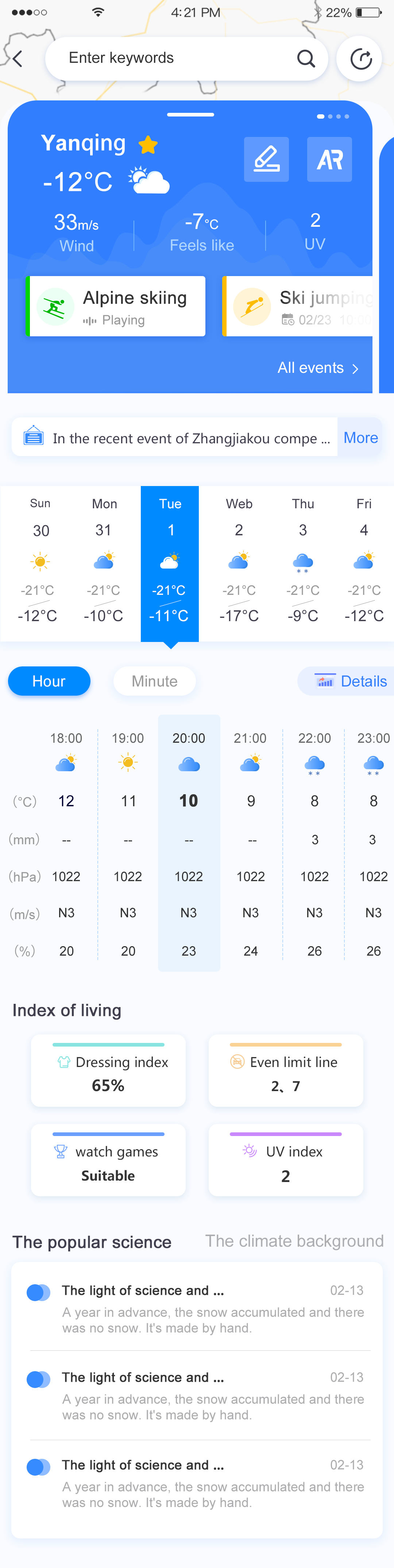 天氣綜述模塊,天氣綜述只要是展示近段時(shí)內(nèi)總體的一個(gè)天氣情況,可以給將要來(lái)參賽或者觀賽人員的一個(gè)友好告知,做好相對(duì)應(yīng)的準(zhǔn)備。