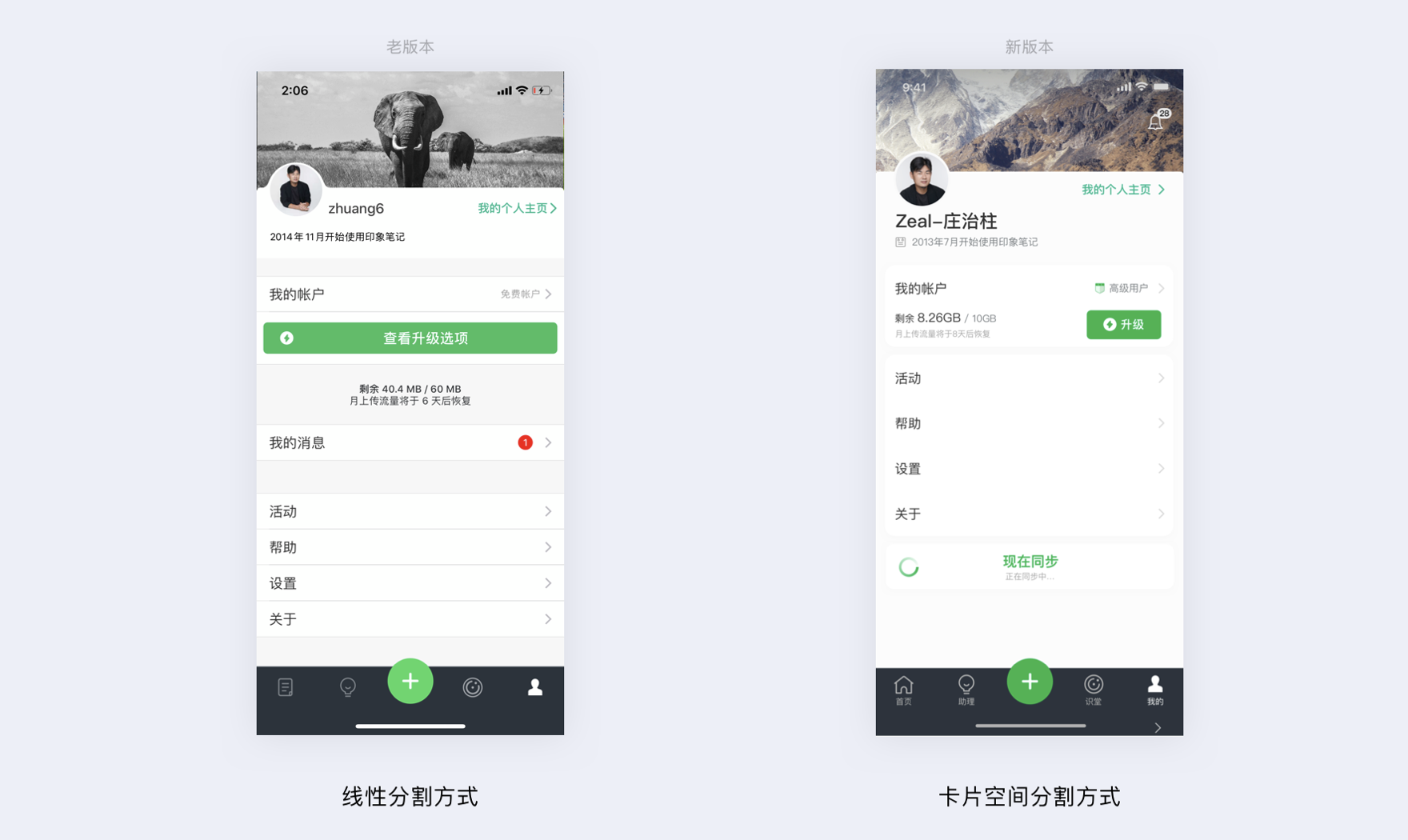 - 模塊化分割:空間分割比線條分割給人更輕松的閱讀感受,如印象筆記老版本(線性分割)與新版本(卡片空間分割)對比。