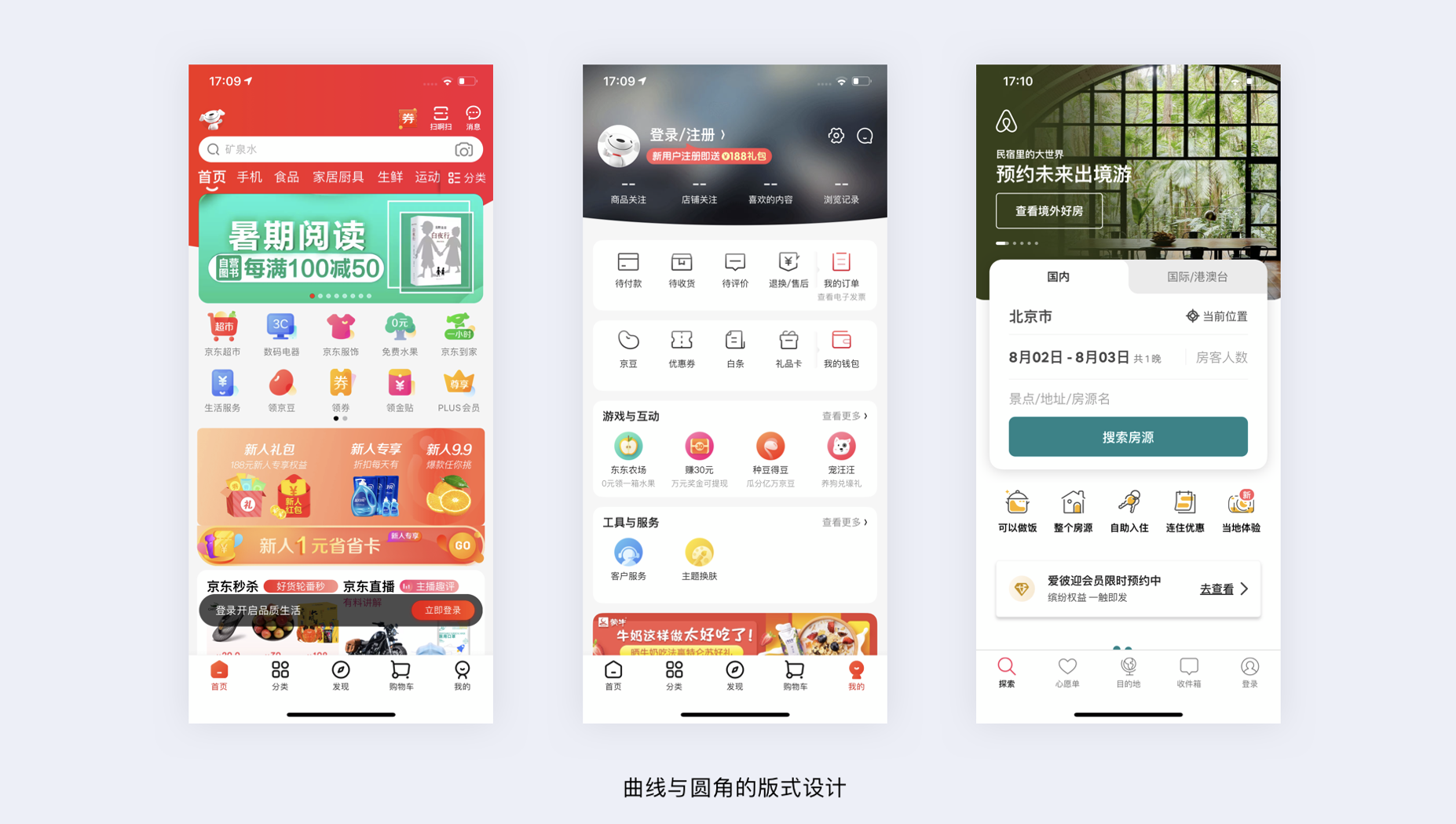 - 曲線與圓角:如京東頂部背景用弧度線條讓界面柔和。