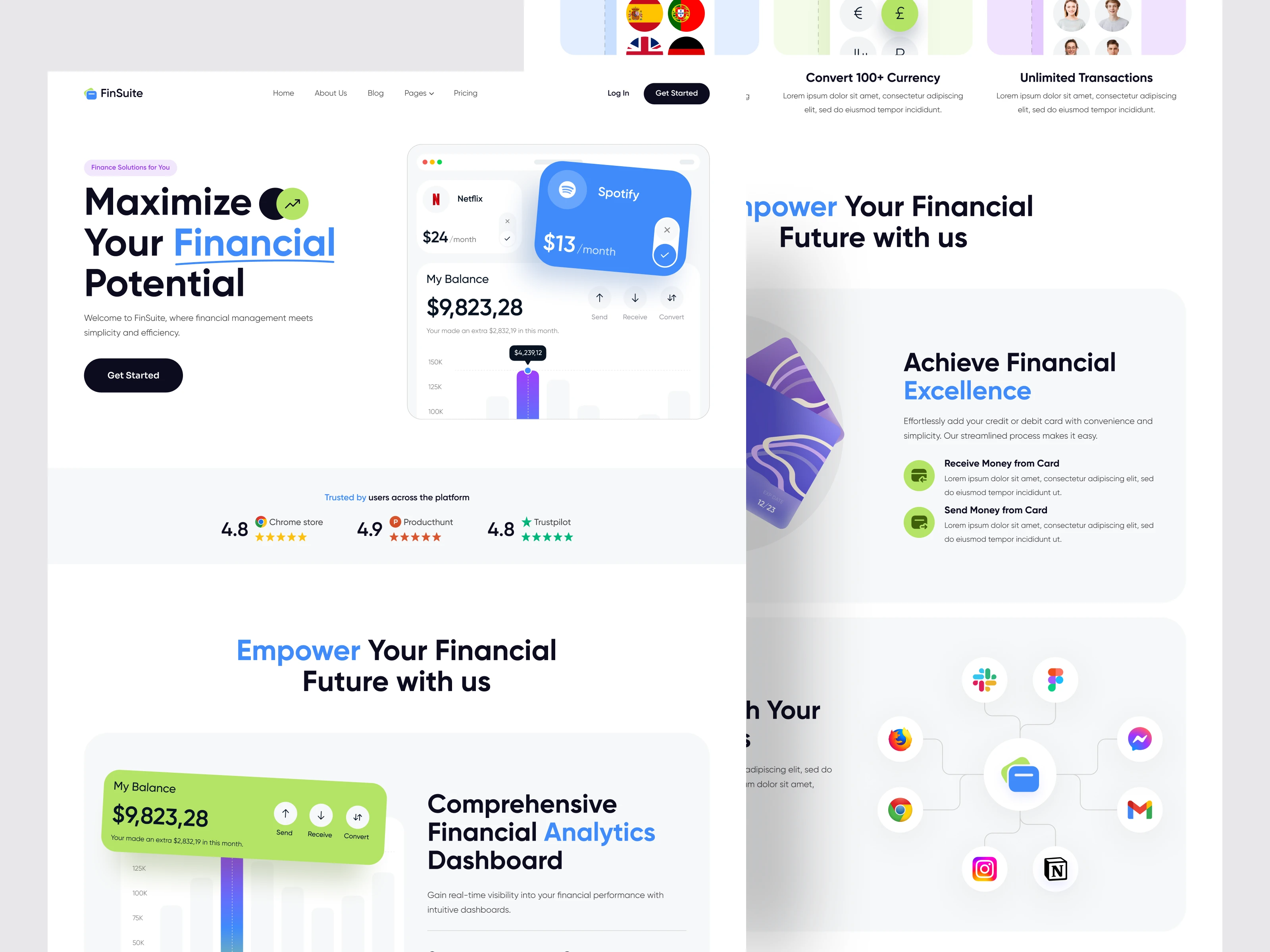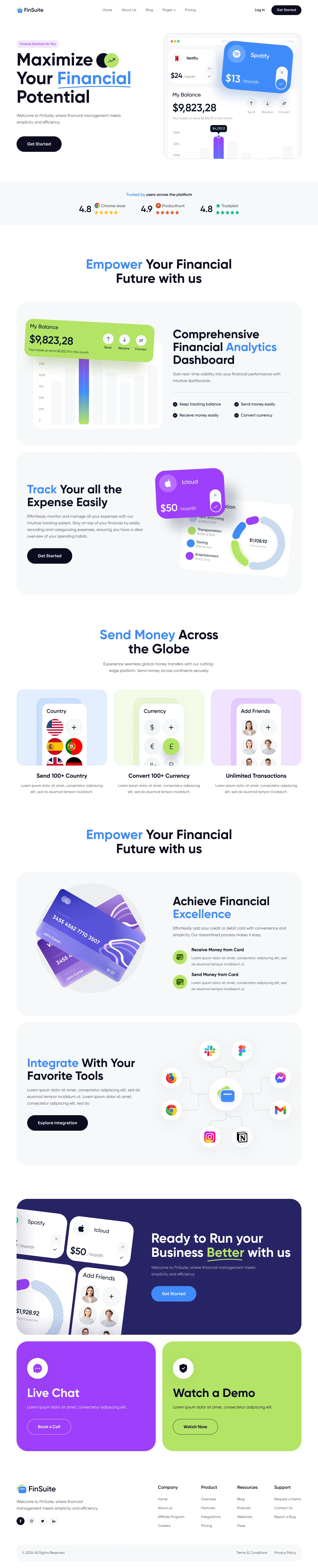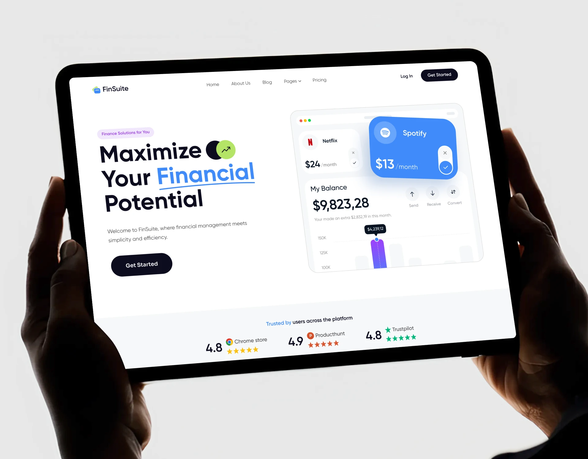 Hero 區:大標題 + 產品截圖 → 直接傳達核心價值(Maximize your financial potential)。