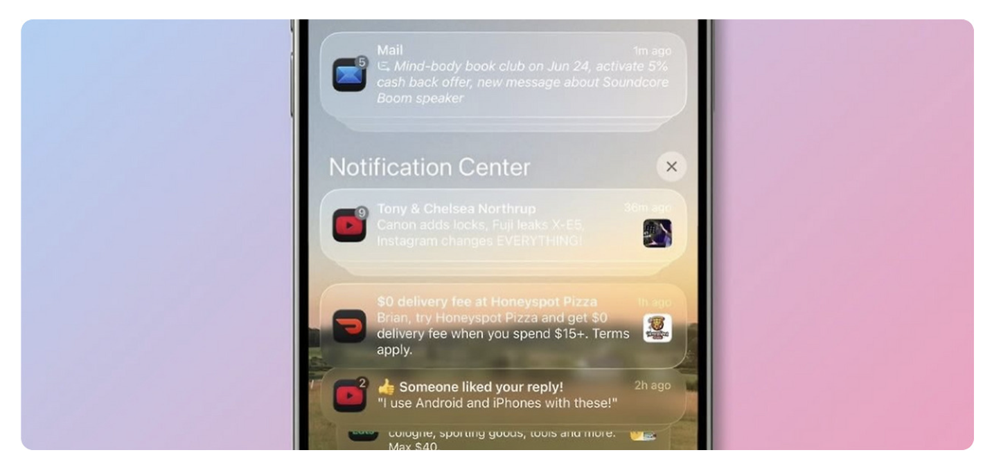 比如看郵件時,如果郵件內容是純文字,玻璃背景會盡量 “隱身”,只保留淡淡的分層;如果郵件里有表格或圖片,背景會自動加強模糊,讓表格的邊框更清晰;就連收到推送時,通知欄的玻璃界面會比背景亮一點,既能提醒我 “有新消息”,又不會像扁平時代的彈窗那樣 “擋視線”。