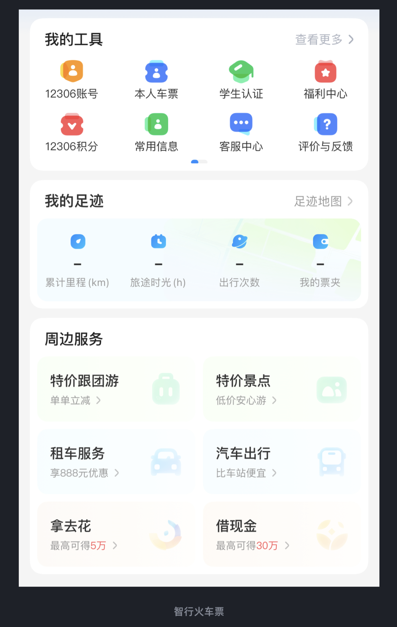 在智行火車票的個人中心里,有 “我的工具”“常用信息”“周邊服務” 三個主要版塊。其中 “我的工具”(12306 賬號、本人車票、學生認證等)和 “常用信息”(我的足跡、我的票夾等)是用戶高頻使用的功能,所以這兩個版塊的圖標用了 “高飽和度、低明度” 的配色,視覺張力強,能第一時間吸引用戶的注意力;而 “周邊服務”(特價跟團游、租車服務、拿去花等)是輔助功能,圖標就采用了 “高明度、低飽和度” 的處理方式,顏色更淺、更柔和,視覺上故意 “弱化”。