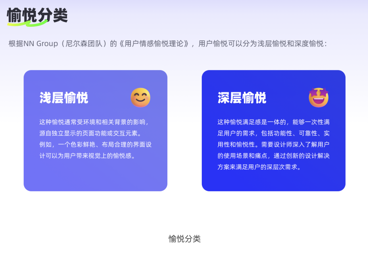 根據尼爾森團隊的《用戶情感愉悅理論》,設計帶來的愉悅感分為兩種,二者的價值和實現方式截然不同,混淆它們很容易讓設計 “浮于表面”。