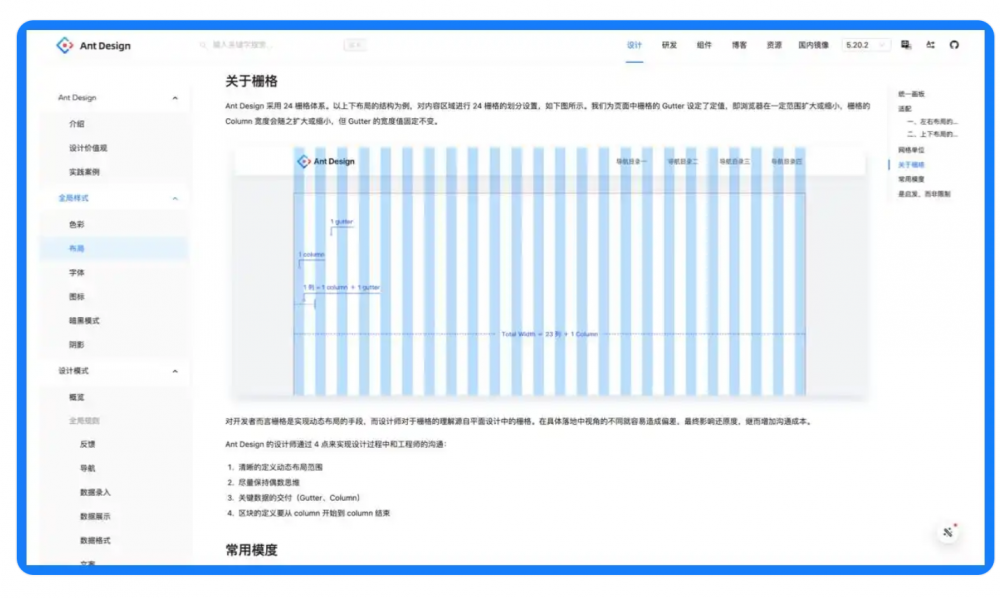 作為國內流行前端設計框架,Ant Design在柵格上的定義也是非常經典的。Ant Design 采用 24 柵格體系。以上下布局的結構為例,對內容區域進行 24 柵格的劃分設置,如下圖所示。頁面中柵格的 Gutter 設定了定值,即瀏覽器在一定范圍擴大或縮小,柵格的 Column 寬度會隨之擴大或縮小,但 Gutter 的寬度值固定不變。