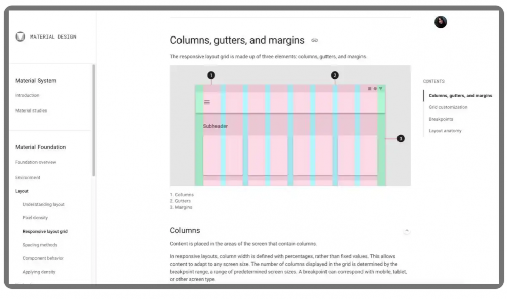 Material Design的柵格布局是響應式的,能夠根據設備的屏幕大小和方向自動調整。設計師可以利用五個斷點(xs, sm, md, lg, xl)來定義在不同屏幕尺寸下的列數和布局方式,從而實現靈活的設計。
