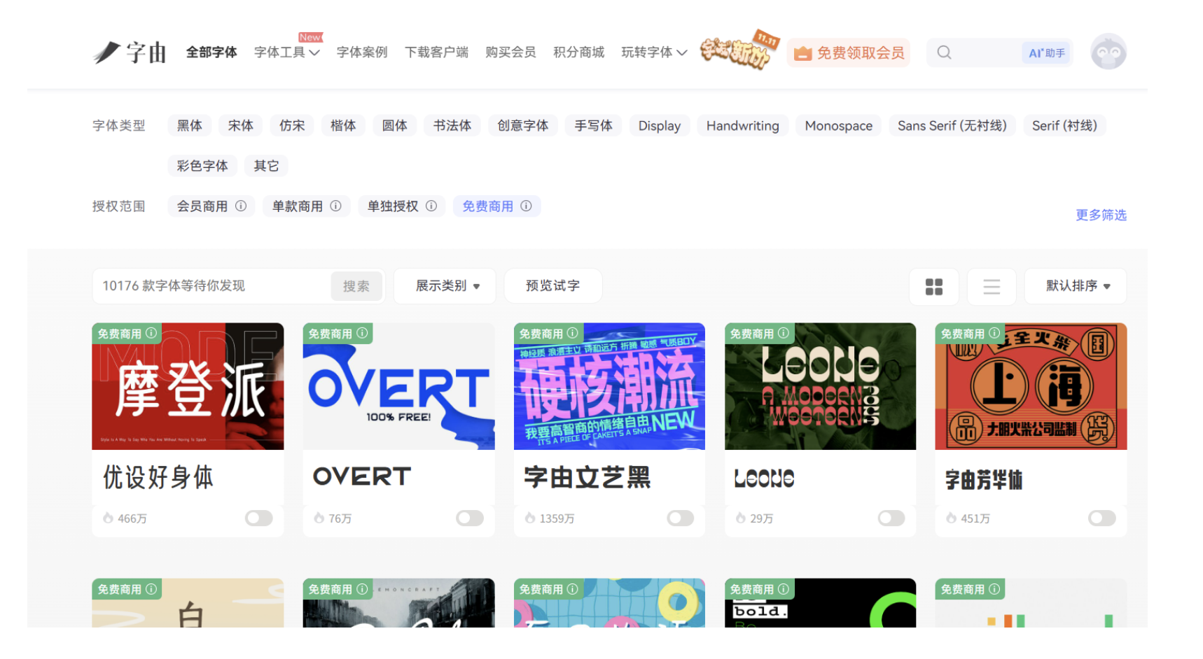 專注于中文字體的貓啃網(wǎng),是個(gè)人設(shè)計(jì)師和小型工作室的福音。平臺(tái)已搜集 758 款免費(fèi)商用中文字體,更新頻率高,經(jīng)常能挖到新發(fā)布的優(yōu)質(zhì)字體,冷門小眾款也能在這里找到。