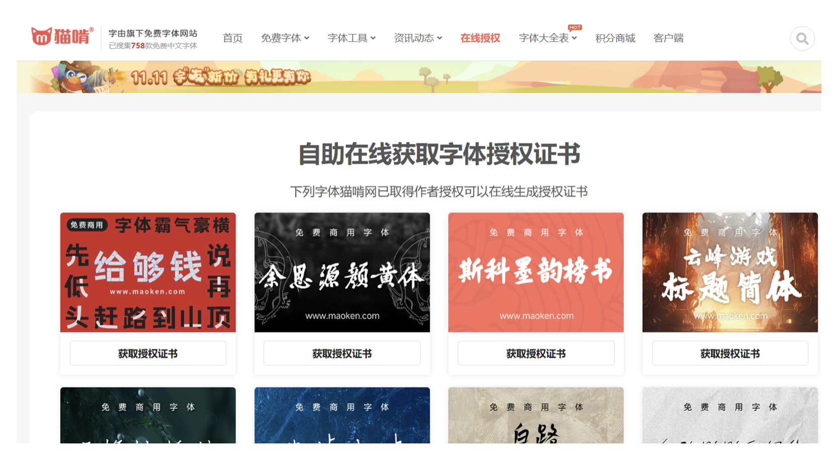 網(wǎng)站界面簡(jiǎn)潔,字體分類清晰,每款字體都明確標(biāo)注授權(quán)信息,可直接下載本地使用,也能關(guān)聯(lián)字由客戶端一鍵應(yīng)用。更貼心的是,部分熱門字體支持在線開(kāi)具授權(quán)證書,面對(duì)客戶的版權(quán)審核需求時(shí)能直接拿出證明,預(yù)算有限又追求設(shè)計(jì)質(zhì)感的話,這里絕對(duì)值得深挖。