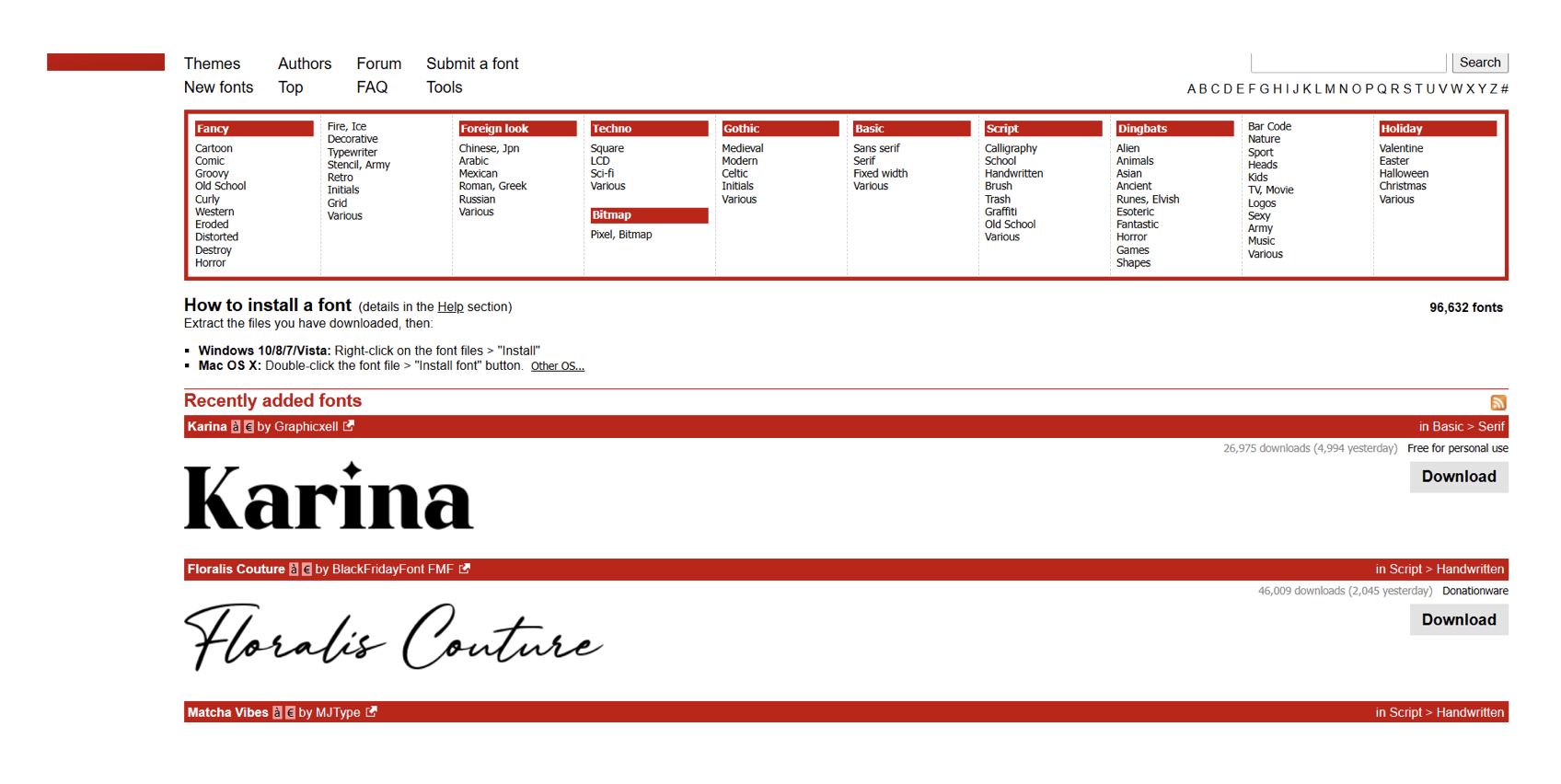 Dafont 是老牌免費(fèi)字體網(wǎng)站,收錄超 4 萬(wàn)款字體,風(fēng)格從經(jīng)典到怪異應(yīng)有盡有,以英文字體為主,也不乏設(shè)計(jì)師自制的創(chuàng)意中文字體。它的分類系統(tǒng)格外細(xì)致,可按主題、風(fēng)格、用途篩選,節(jié)日海報(bào)、游戲界面等特殊場(chǎng)景的字體需求,在這里都能找到驚喜。