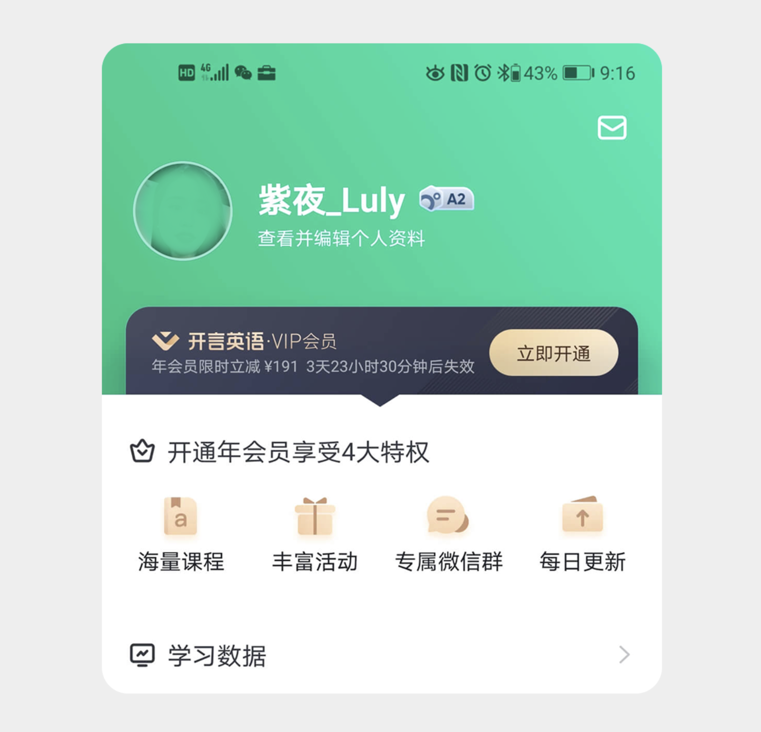 開言英語的 VIP 會員開通頁面,以簡潔有力的形式感突出核心價值。頁面聚焦 “年會員限時立減” 的優惠信息,用醒目字體強調折扣力度和時效,瞬間抓住用戶注意力。