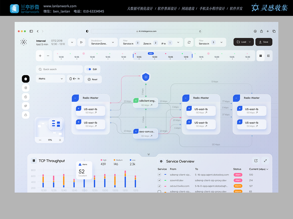 色彩編碼是這套設(shè)計的 “隱形語言”:服務(wù)節(jié)點的「藍 - 綠 - 藍」區(qū)分核心組件與依賴服務(wù),流量鏈路的「粉 - 紅 - 黃」對應(yīng)數(shù)據(jù)傳輸?shù)牟煌瑺顟B(tài),底部 TCP 吞吐量的「橙 - 粉 - 藍」則以色彩區(qū)分 “高 - 中 - 低” 負載 —— 這種 “色彩即信息” 的設(shè)計,讓技術(shù)人員無需精讀數(shù)值,即可通過視覺直覺快速判斷系統(tǒng)狀態(tài),契合后端監(jiān)控 “秒級響應(yīng)” 的核心訴求。