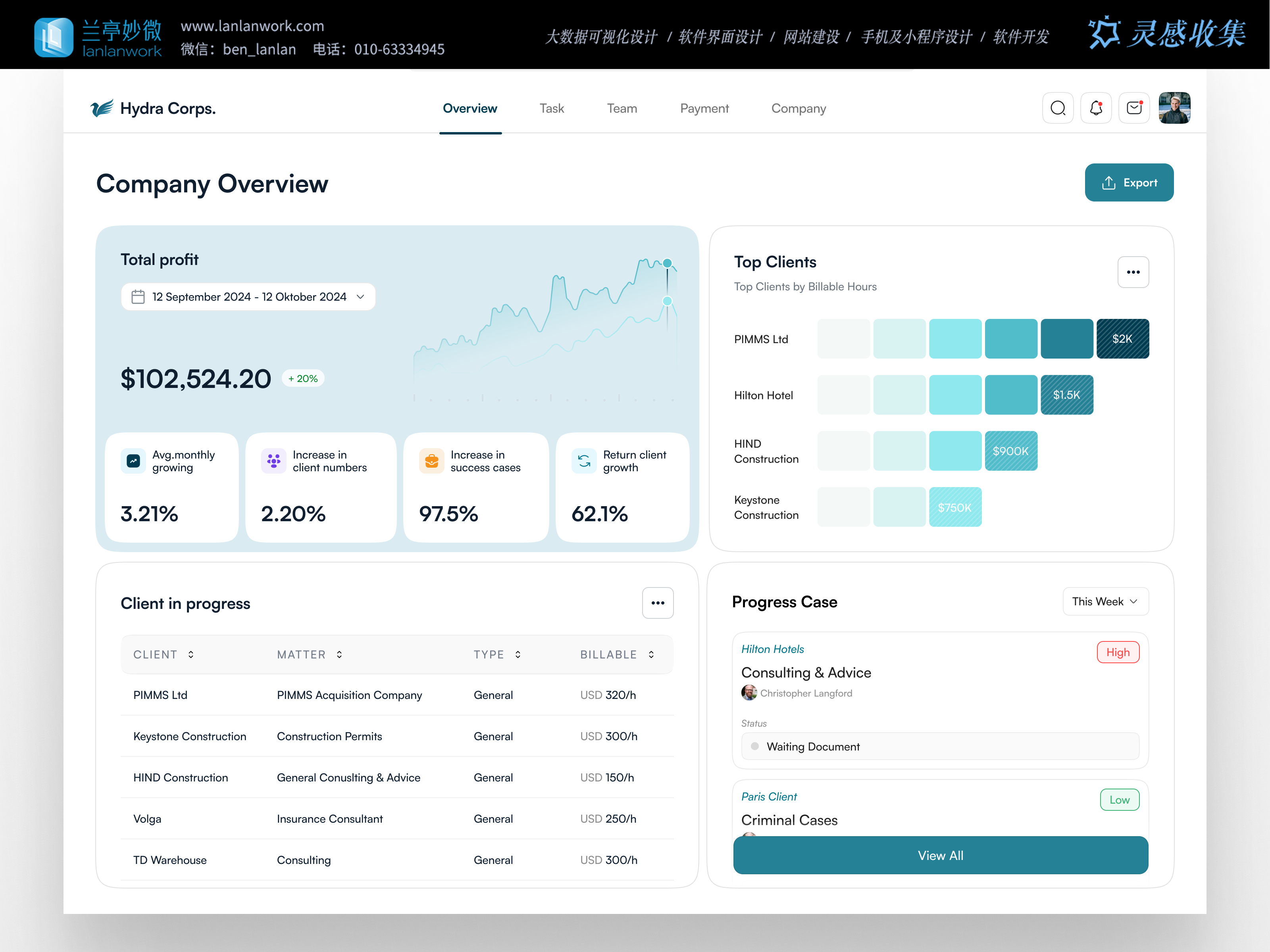 信息的 “極簡表達”:避免專業術語的堆砌,用 “Top Clients by Billable Hours” 等口語化標題替代 “客戶營收貢獻分析”,二級指標用 “3.21% Avg monthly growing” 的短句式呈現,讓數據解讀成本降低 50%