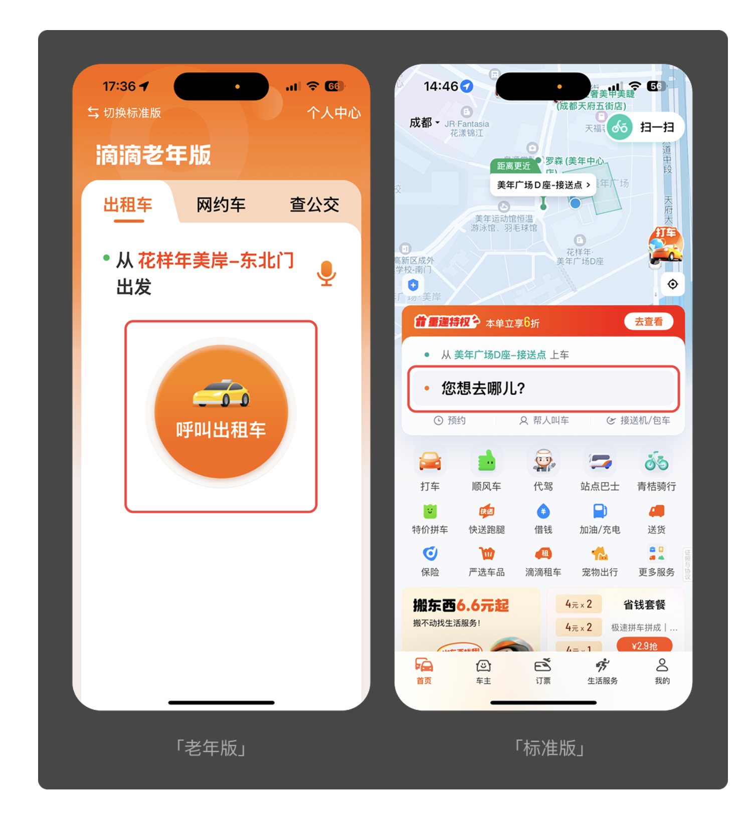 對老年人而言,多余的操作步驟就是無形的門檻。優秀的適老化設計會砍掉非必要功能,讓核心需求一鍵直達。滴滴老年版便是典型案例:標準版需要先輸入目的地再點擊叫車,而老年版直接在首頁設置 “呼叫出租車” 大按鈕,省去輸入環節,讓用戶無需學習就能完成叫車。QQ 老年版同樣簡化了動態查看流程,標準版需兩次點擊才能進入的頁面,老年版一次點擊即可直達,大幅提升操作效率。