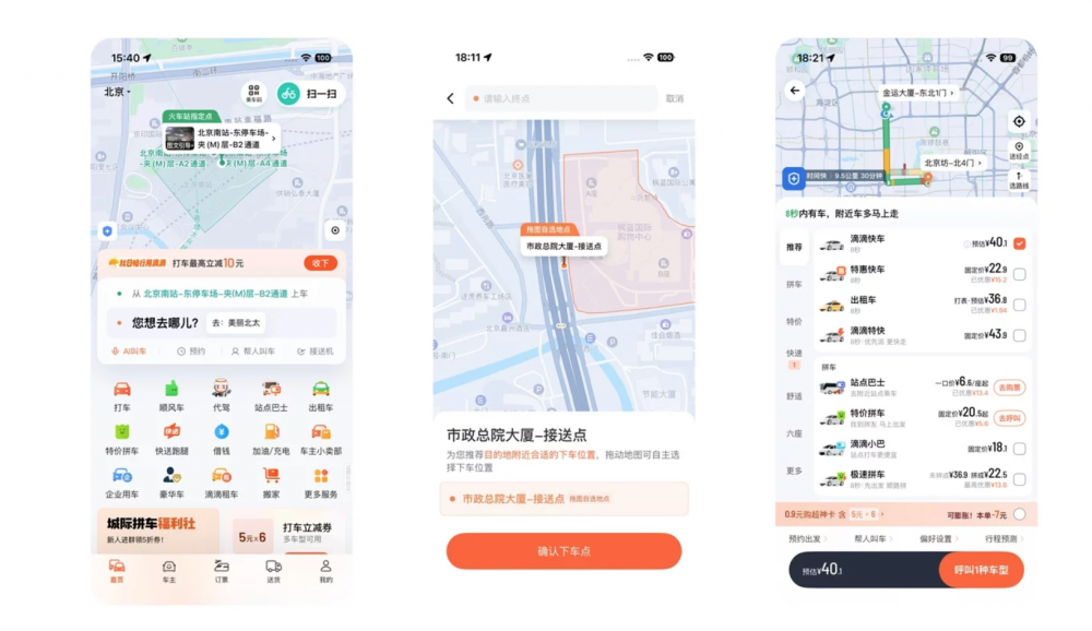 滴滴國內(nèi)版的首頁同樣可劃分為五大功能區(qū)域,但在功能優(yōu)先級與信息承載度上與國際產(chǎn)品差異顯著。核心區(qū)域除地圖展示、地址填寫等基本需求外,還融入了上車點(diǎn)實(shí)景圖等魅力需求,提升用戶體驗(yàn);其他功能區(qū)則整合了 AI 叫車、預(yù)約、代叫、接送機(jī)等叫車衍生服務(wù),以及順風(fēng)車、代駕、站點(diǎn)巴士、出租車等多元出行選項(xiàng)。
