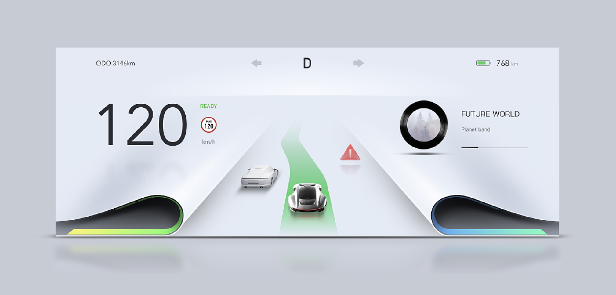 添加微小的情感化設(shè)計,提升用戶好感度:例如車速過快時,儀表邊緣光影從藍色漸變至橙色,以視覺提示替代生硬的文字警告;電量充足時,背景紋理呈現(xiàn)柔和的光暈效果,傳遞安心感;導(dǎo)航轉(zhuǎn)向提示時,用流暢的動態(tài)線條引導(dǎo),避免突兀的圖標(biāo)閃爍。情感化設(shè)計需 “潤物細無聲”,避免過度花哨影響核心功能使用。