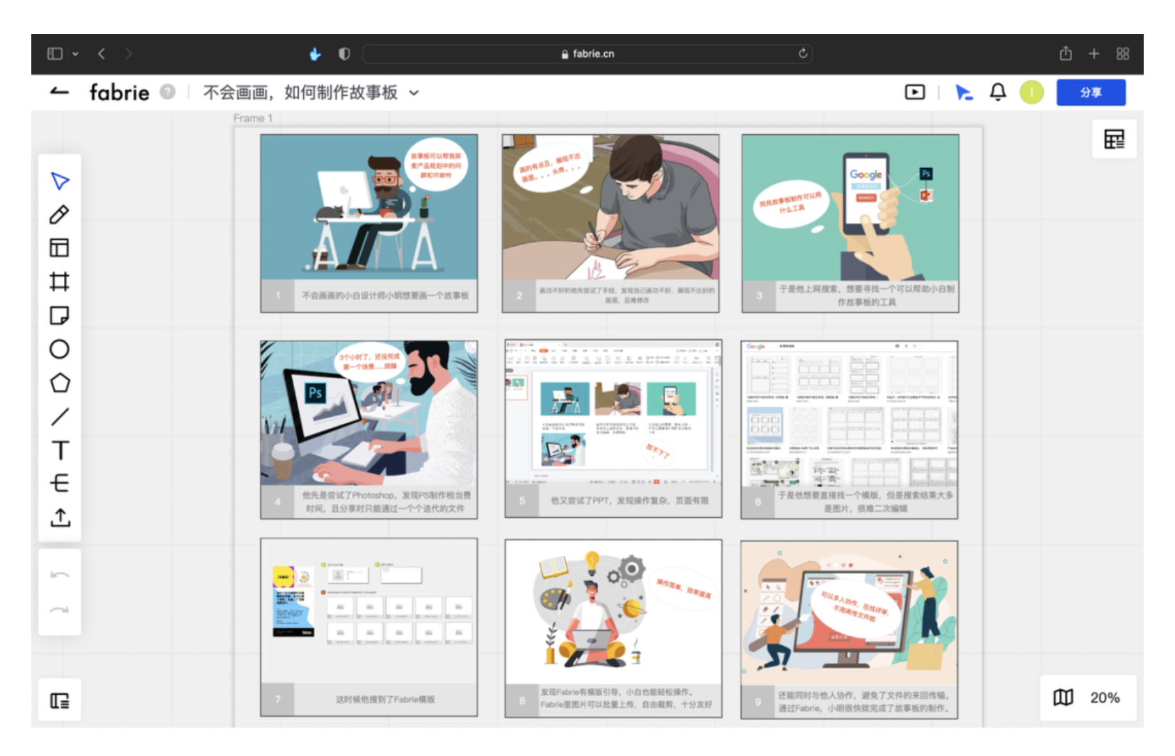 - 故事板:即使不會畫畫,也能通過模板快速搭建場景,用圖片、文字還原用戶使用產(chǎn)品的過程,直觀展現(xiàn)設計價值。