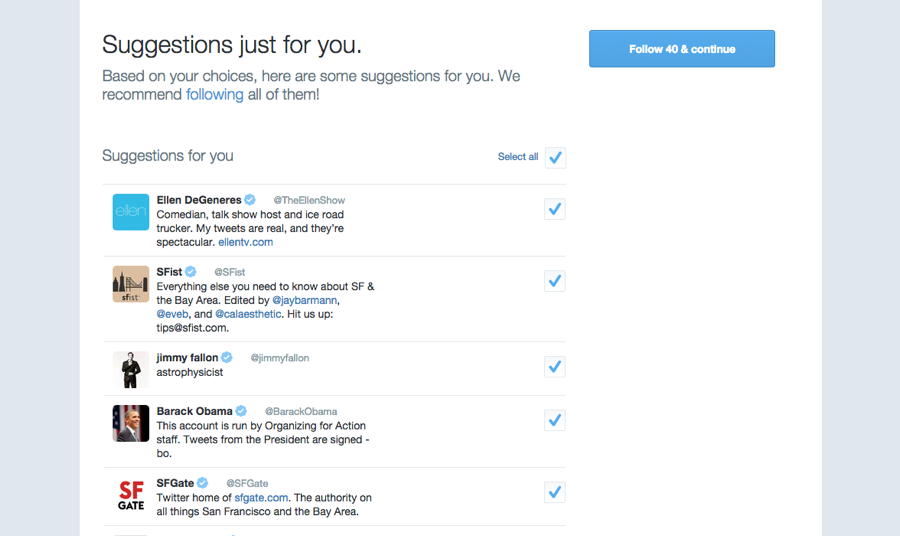例如,Twitter為了強化習慣路徑,在新手引導流程中建議新用戶可以關注的人。一旦確定某個路徑能促進用戶路轉粉,你也會想做類似的事情。