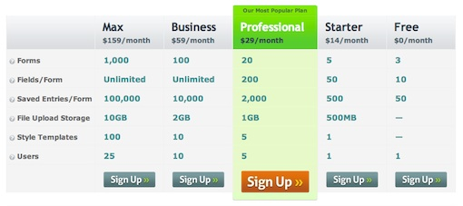 看一下Invoice Machine的例子,表格里除了最上面的三種功能,其他功能的四個條目項都一樣。該表格因此增加了沒有必要的15行。解決方法可以通過一個簡單的公告列表說明“我們的計劃都包括以下功能”,用戶能夠快速看到,他們無論選擇哪個計劃,都會具備這些功能。表格只需要縮短成3-4行,用來顯示不同的部分。我再次重申,表格應該讓信息更易讀。如果您的表格不符合這一目標則會適得其反。