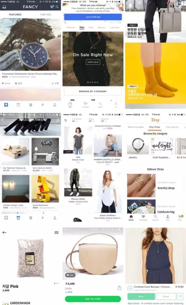 接下來我們就需要對這些 apps 進行視覺風格上的拆分,來看看到底是哪些視覺表現讓大家覺得它們是時尚、簡潔的。我們可以依據經驗對視覺表現劃分幾個維度(比如以下幾個),接下來我將以購物應用為例,從以上幾個維度來示意分析的方法。
