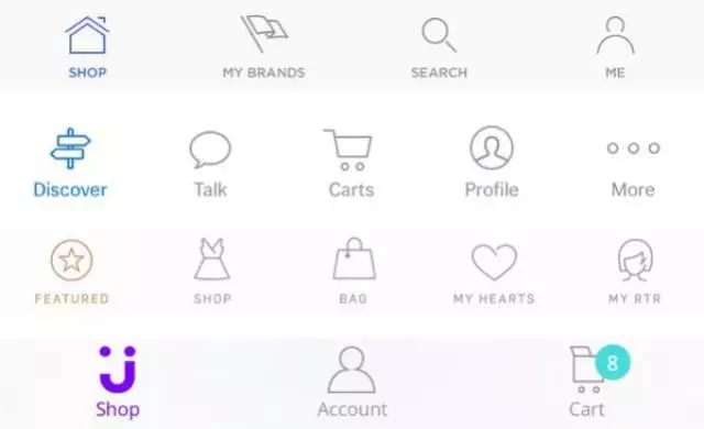 每款APP都需要一套易于識別的 icon來輔助信息展示。雖然在這一塊設計師的話語權更強,但我也見過不少因為icon的設計風格而吵得不可開交。就拿是填色icon還是線條 icon來說,我們把準備的幾款 APP拉出來看一下就知道了。就當前情況來看,線條icon更符合大家對于時尚、簡潔的理解。