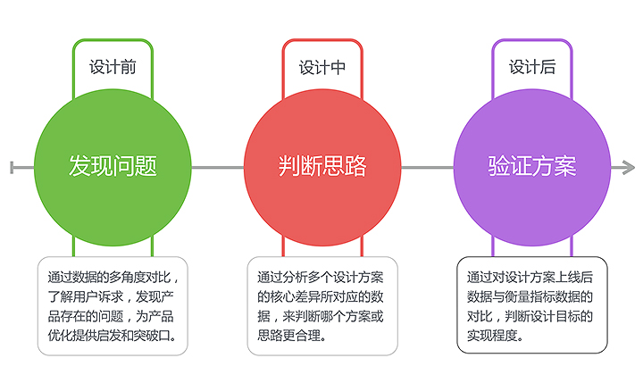 設計師如何使用數據,在設計前(從用戶訴求到設計目標過程中,設計師需要充分了解用戶訴求)、設計中(從設計目標到設計方案過程中,設計師需要分析哪個設計方案更優)、設計后(設計上線后,設計師要分析產品有沒有達到設計目標)這3個過程中需要進行數據分析,因此數據在設計中的價值有以下3點: