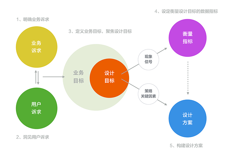 明晰了底層世界觀后,我們團隊逐層向上累積出了我們的方法論,包括thinkflow,workflow,等等,其中最具有代表性的就是剛才提到的《五導家》。五導家是一種設計崗位的思考過程方法論,它包含一個以目標用戶為源頭的5步驟思考路徑,及相關方法和原則,通過深度解構+全鏈路串聯的方式,總結和表達作為職能部門的UED團隊在設計工作中思考路徑的普遍規律,力爭將原來那些模糊、零散的概念信息(如業務訴求、用戶訴求、業務目標等)及思考環節(如何從訴求到目標,如何從目標到指標,如何從目標到方案等)進行串聯和體系化。