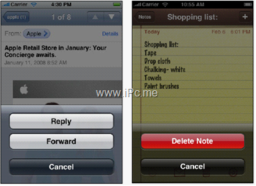屏幕的底部一般是輔助性的工具欄或切換視圖使用的頁簽欄。一些影響較大的操作如果出現在屏幕下半區域,必須仔細考慮它們的排列設計。如圖5.1,一 般情況下,操作面板的取消按鈕放在最后,這樣可以鼓勵用戶閱讀完所有的選項,暗藍色的返回按鈕可以和一般的按鈕區分開來,即便用戶沒閱讀完也知道這是返回 按鈕。對于一些影響較大的操作(如刪除),將其放在面板的頂部是最好的,因為頂部更容易被看到,再加上紅色的警告暗示,用戶選擇起來會更為慎重。