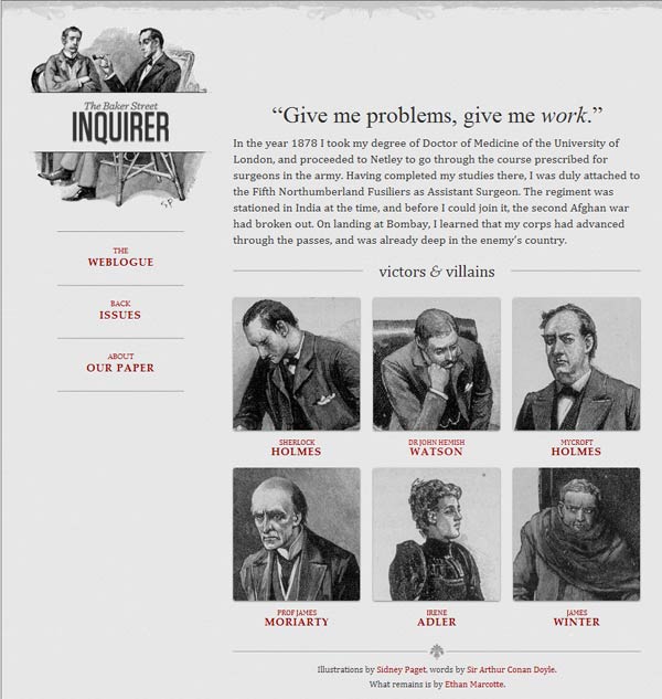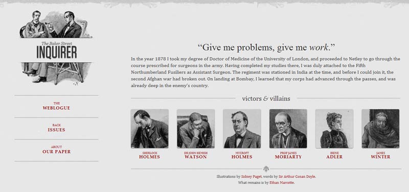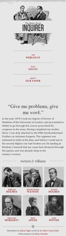 他制作了一個范例 ,里面是《福爾摩斯歷險記》六個主人公的頭像。如果屏幕寬度大于1300像素,則6張圖片并排在一行。