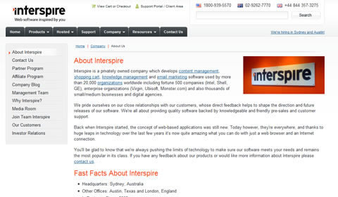 當你在設計中克制而明智地使用色彩時,吸引訪客對重要項目的注意力就變得相當容易。在 Interspire 的 “About Us(關于我們)” 頁面中,訪客的注意力被迅速吸引到頁面頂部LOGO那紅色的一點上,然后是標題,然后是頁面右邊的LOGO照片。