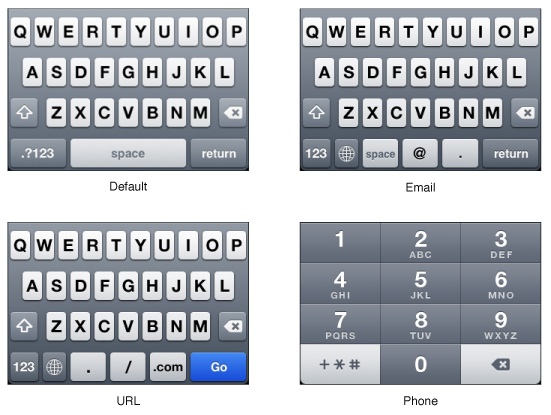 - 智能手機的系統平臺當中通常都會內置一些針對不同類型內容的鍵盤,例如文本、數字、Email、URL等。在你的應用中,確保針對不同的內容類型使用對應的鍵盤,提升用戶輸入的效率。