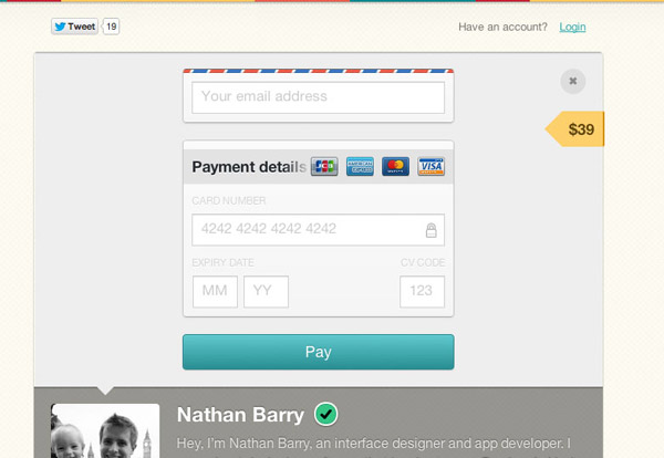 Gumroad在未登錄狀態的支付表單中剔除了很多常見的“必填”字段,最終只保留了用于輸入郵箱地址、信用卡號、有效期和CV碼的文本框。如果連未登錄時的支付環節都可以被如此簡化,我相信對于其他方面業務的那些復雜表單來說,不會沒有優化空間的。
