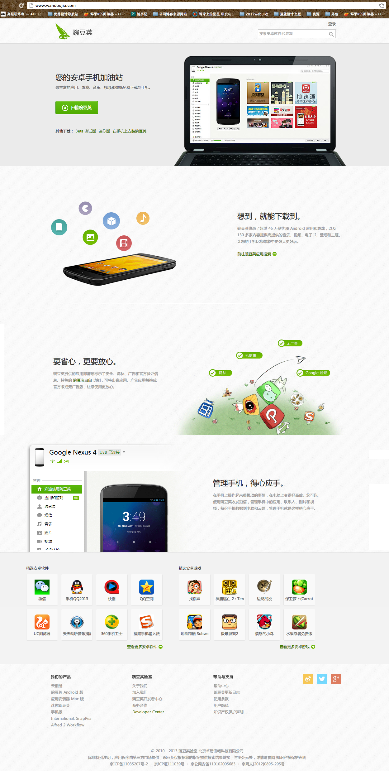 6改版后的豌豆莢手機精靈官網http://www.wandoujia.com/,極簡主義,該突出的重點“軟件界面圖片”更大更顯眼,去掉了任何多余的東西,下載按鈕顯的更萬灰眾中一點綠,更易找到,增加轉化率。